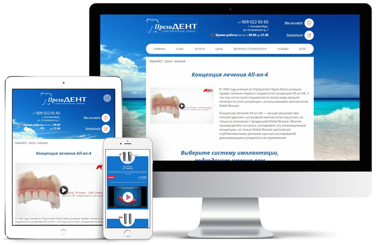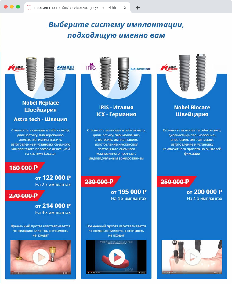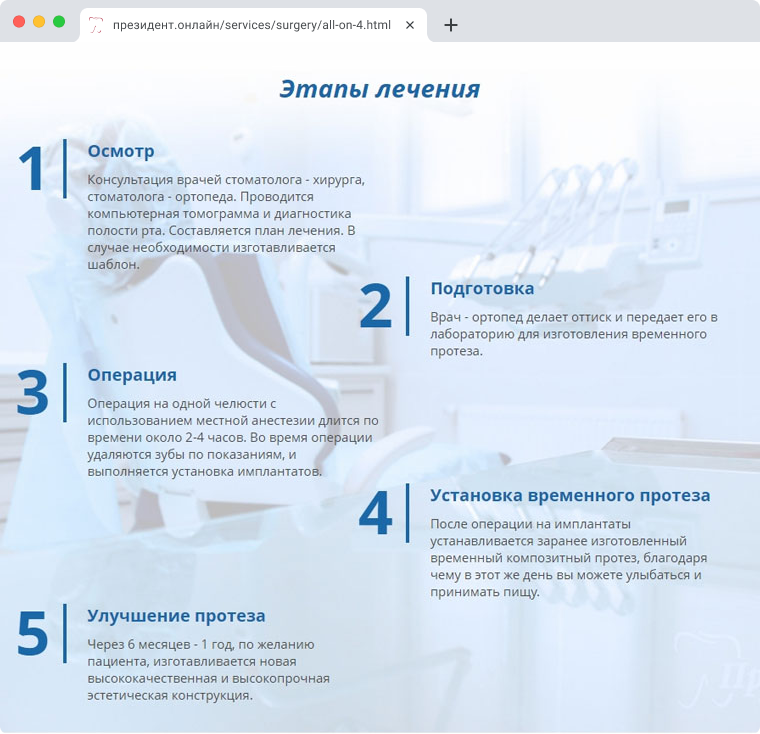 Стоматология «Президент» оказывает услуги по имплантации зубных протезов по всемирно известной концепции All-on-4 или по-русски «все на четырех». Для того, чтобы пациенты могли понять как происходит эта процедура, из чего складывается стоимость услуги - нами была разработана посадочная страница внутри готового сайта.