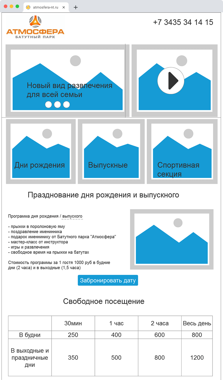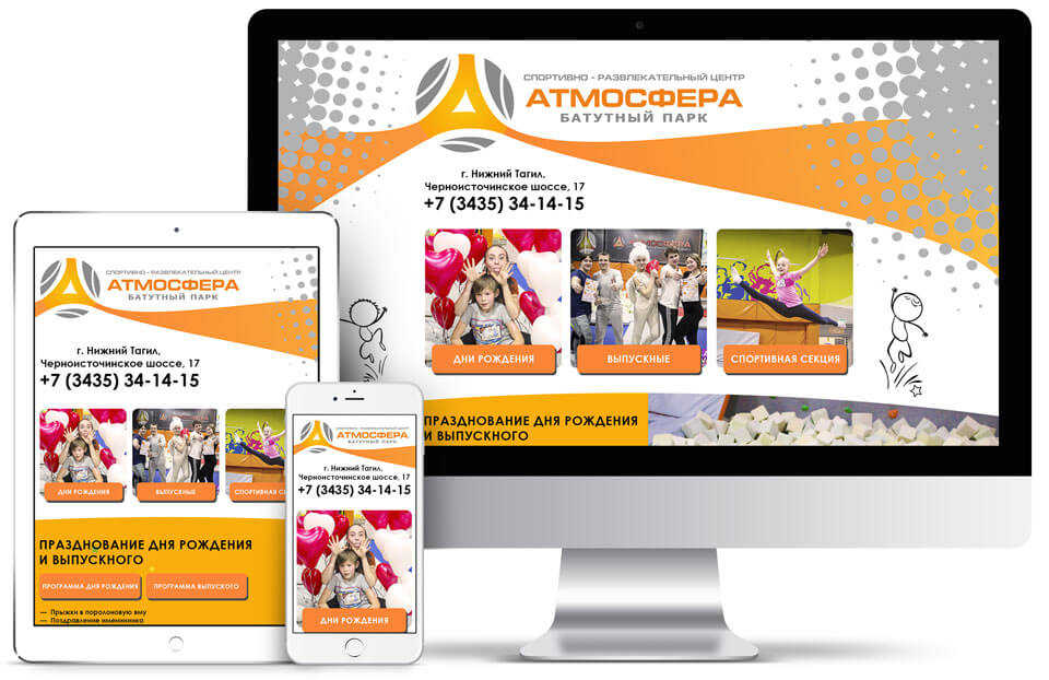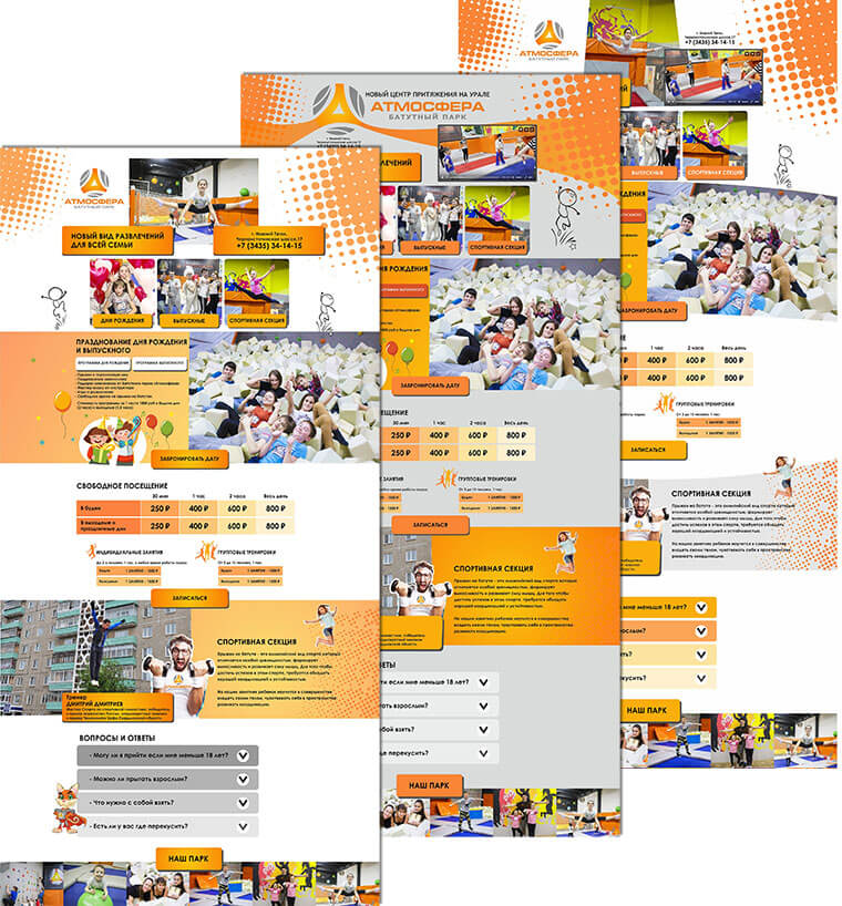 Атмосфера – крутой батутный парк в Нижнем Тагиле. Парк работает уже несколько лет, но сайт решили сделать только сейчас. Перед нами поставили задачу, сделать так, чтобы сайт был: