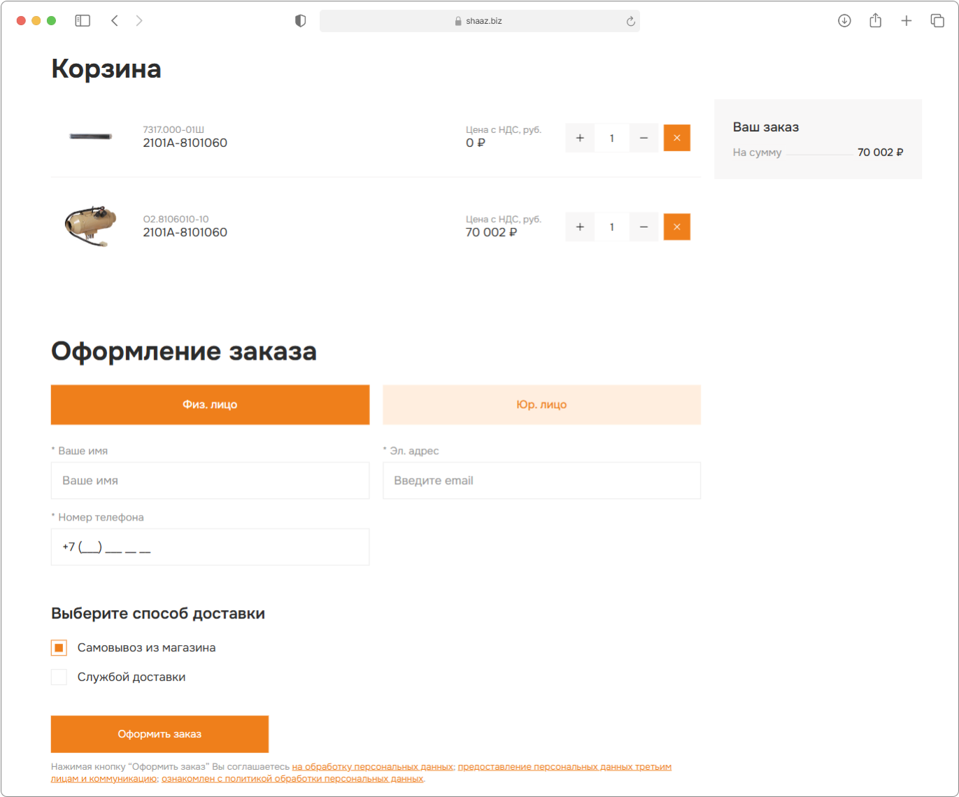 Раздел «Автокомпоненты» мы сделали как привычный интернет-каталог: товары, корзина и оформление заказа — всё на одной странице. Это удобно для покупателей и ускоряет процесс покупки.