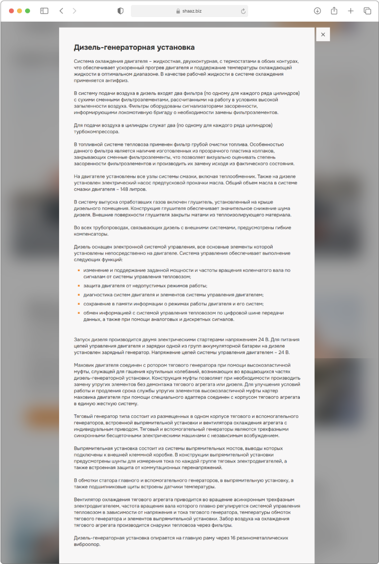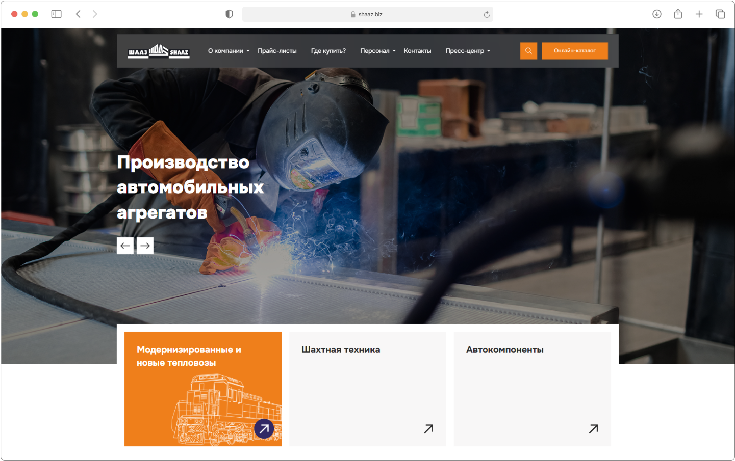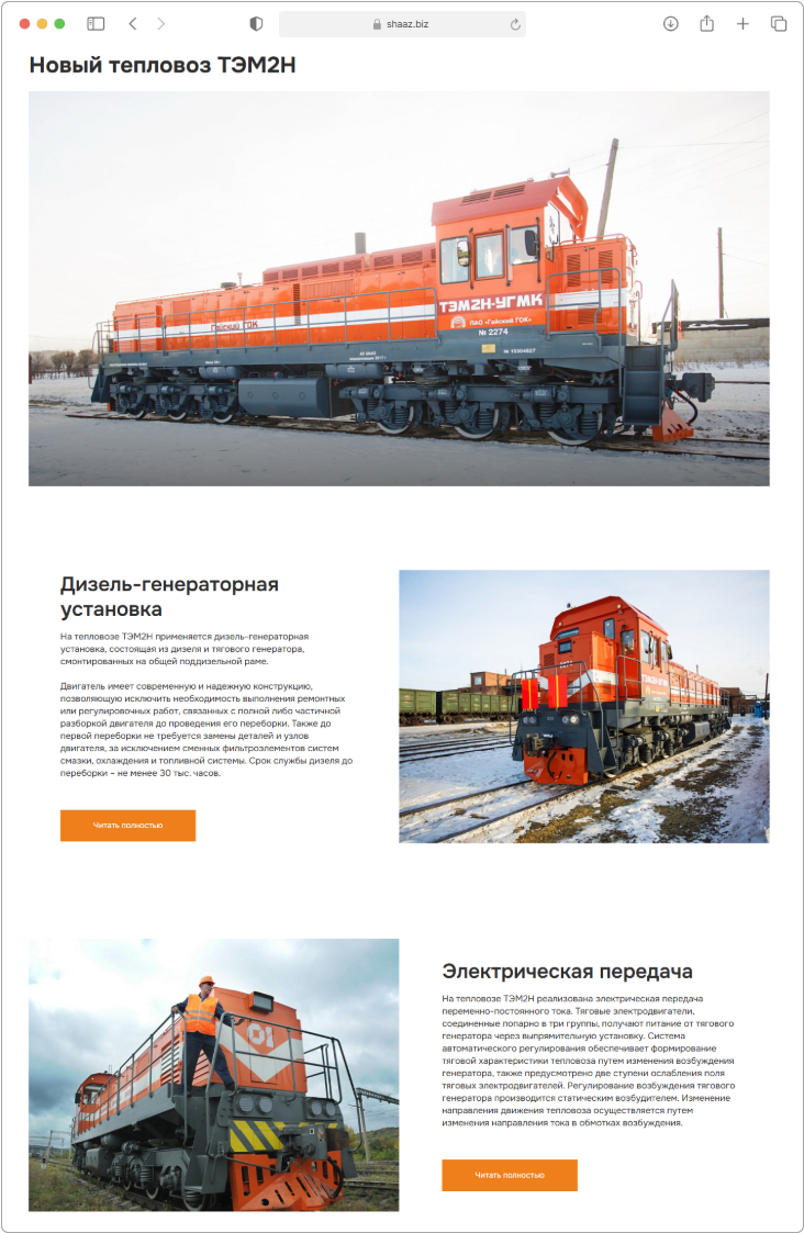 А вот «Модернизация и изготовление тепловозов» и «Шахтная техника» требуют другого подхода. Здесь важнее не корзина, а презентация. Поэтому мы собрали специальные лендинги: они работают как конструктор из блоков и позволяют разместить большой объём информации. Подробности не перегружают страницу — дополнительные материалы открываются в модальных окнах.