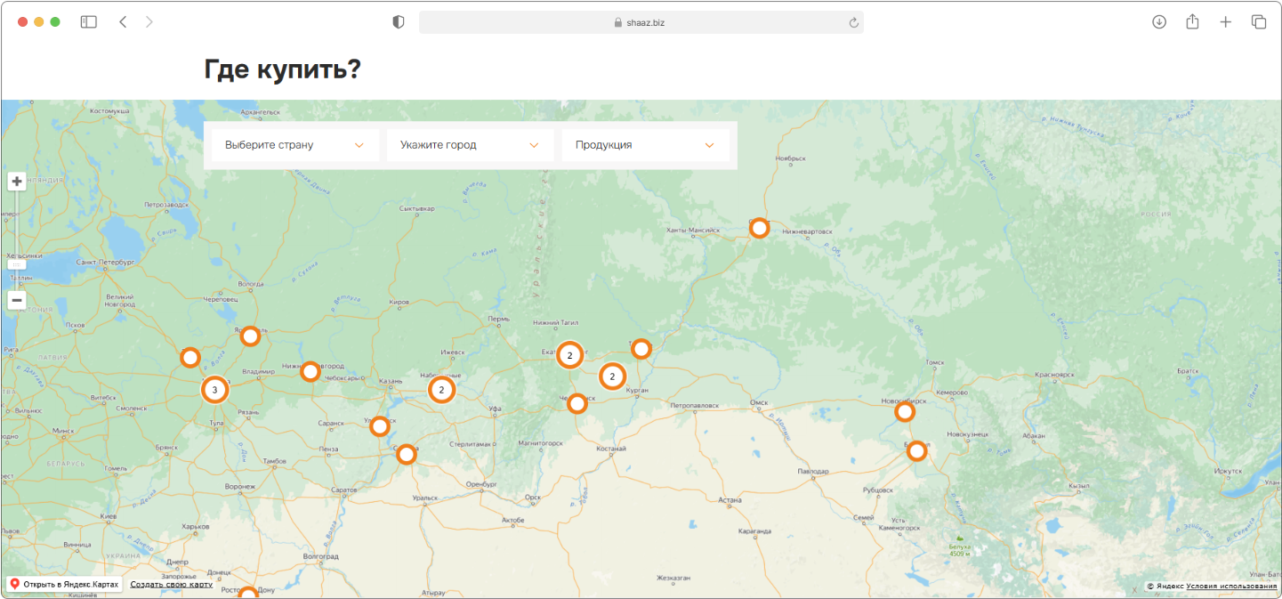 Интерактивная карта в разделе «Где купить» облегчает поиск нужного филиала по России, Белоруси и Казахстану. На карте реализован гибкий поиск и фильтрация по стране, городу и нужной продукции.