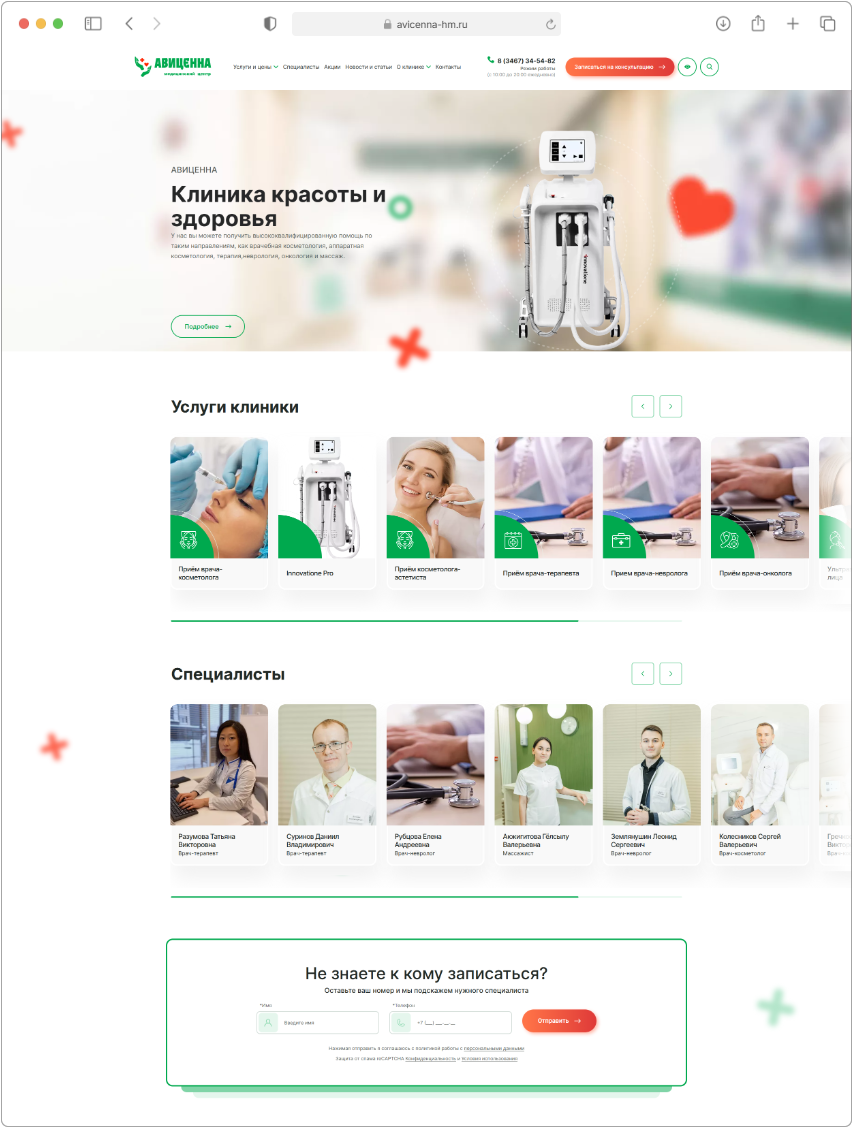 Для клиники «Авиценна» мы вместе с SEO-специалистами разработали структуру сайта и подключили онлайн-запись.
