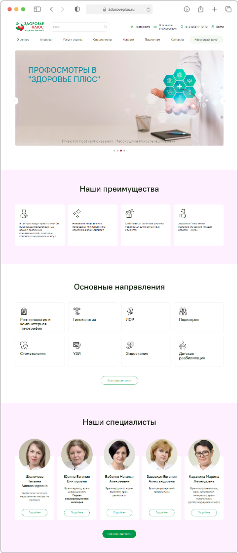 Для многопрофильного медицинского центра «Здоровье Плюс» мы модернизировали основные страницы, сделав сайт современным и понятным.